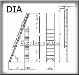 La escalera apoyo DIA, es una escalera de acceso portátil para altillos, entreplantas, azoteas. La escalera de acceso Dia esta fabricada en aluminio extruído nervado de perfil "C". Los peldaños de 10 cm de profundidad están soldados al montante formando una escalera muy resistente y segura.