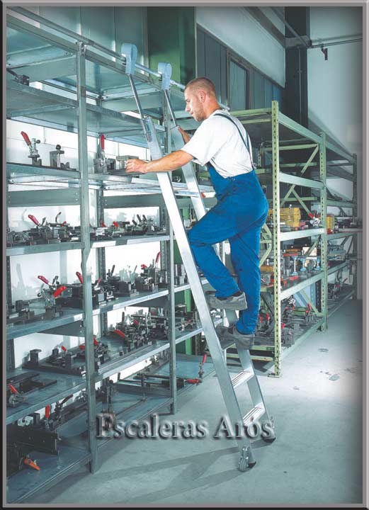 La escalera Corredera de aluminio, es una escalera diseñada para ser utilizada en almacenes y bibliotecas. Está dotada de un sofisticado sistema de conexión y desplazamiento sobre carril para un deslizamiento suave y constante. Tiene una capacidad de carga de 150 kg y una garantía de fabricación de 5 años.